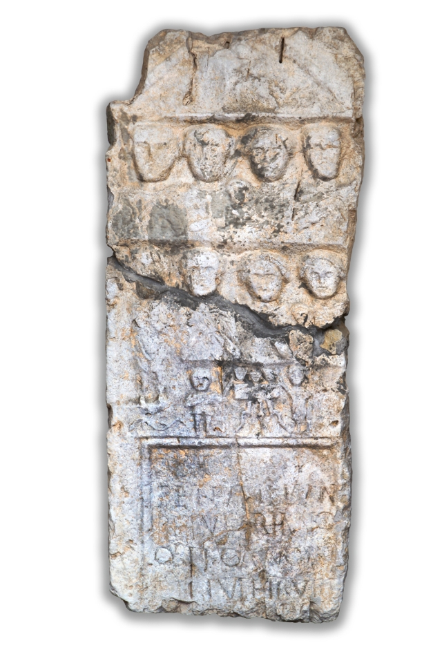Rimska nagrobna plošča je izklesana iz apnenca in obdelana reliefno. V spodnjem delu je pravokotno obrobljen napis. Nad napisom je daritvena miza s tremi posodami, levo in desno pa stojita služabnika, ki sodelujeta pri daritvi. Na levi strani je kos vitice. Nad to daritvijo je v dveh vrstah upodobljenih osem umrlih odraslih oseb in trije otroci. Vse podobe so doprsne, spodnja leva oseba pa je prikazana v celoti in je oblečena v togo. V zaključku nagrobnika je jezdec na konju, desno od njega je kozel, na levi pa še neka žival.