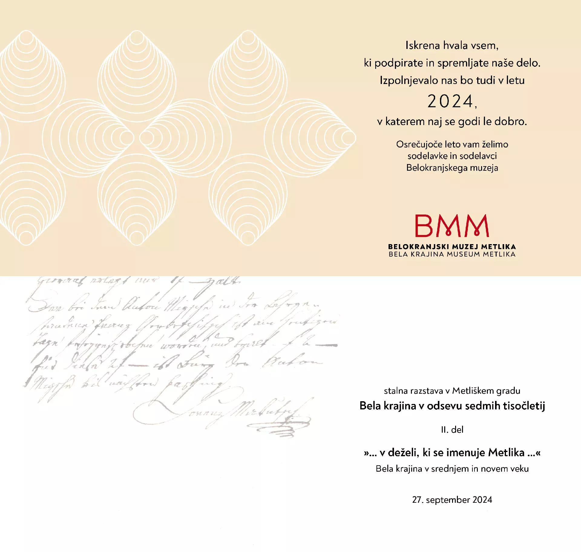 Napoved nove razstave Stalna razstava v Metliškem gradu Bela krajina v odsevu sedmih tisočletij 2. del V deželi, ki se imenuje Metlika. Bela krajina v srednjem in novem veku 27. september 2024