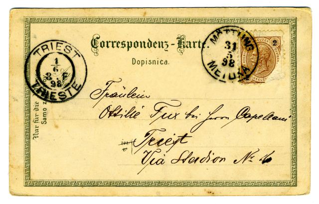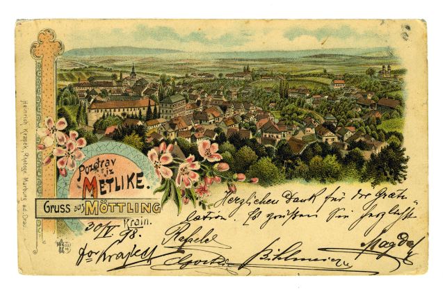 Razglednica Metlike, ki jo je izdal založnik Heinrich Krapek iz Maribora, je bila odposlana leta 1898. Napisana je bila 30. maja, na pošti v Metliki so jo žigosali 31. maja, na pošto v Trst pa je prispela 1. junija 1898.