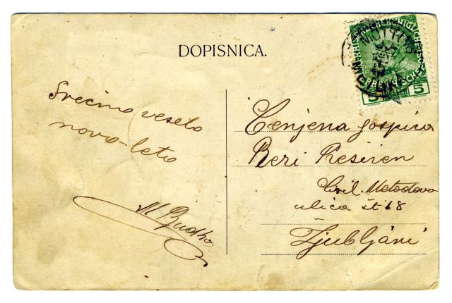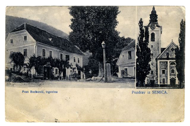Razglednica je bila odposlana 27. decembra 1911 iz Metlike v Ljubljano. Založil jo je trgovec Franc Budkovič, ki je imel v Semiču trgovino z mešanim blagom.
