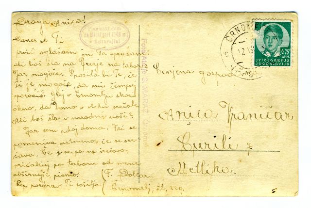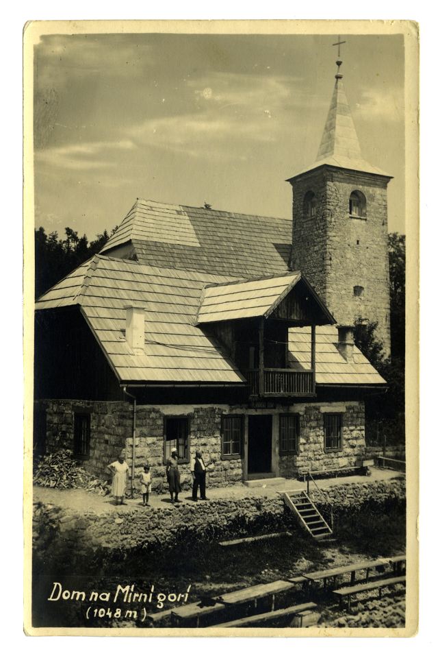 Planinski dom na Mirni gori so odprli 18. avgusta 1929. Tako dom kot cerkev sv. Frančiška so leta 1942 požgali Italijani. Razglednico je izdal S. Maraž, ki je imel fotoatelje v Črnomlju. Odposlana je bila 12. julija, žigosana na pošti v Črnomlju, letnica na žigu pa ni vidna.