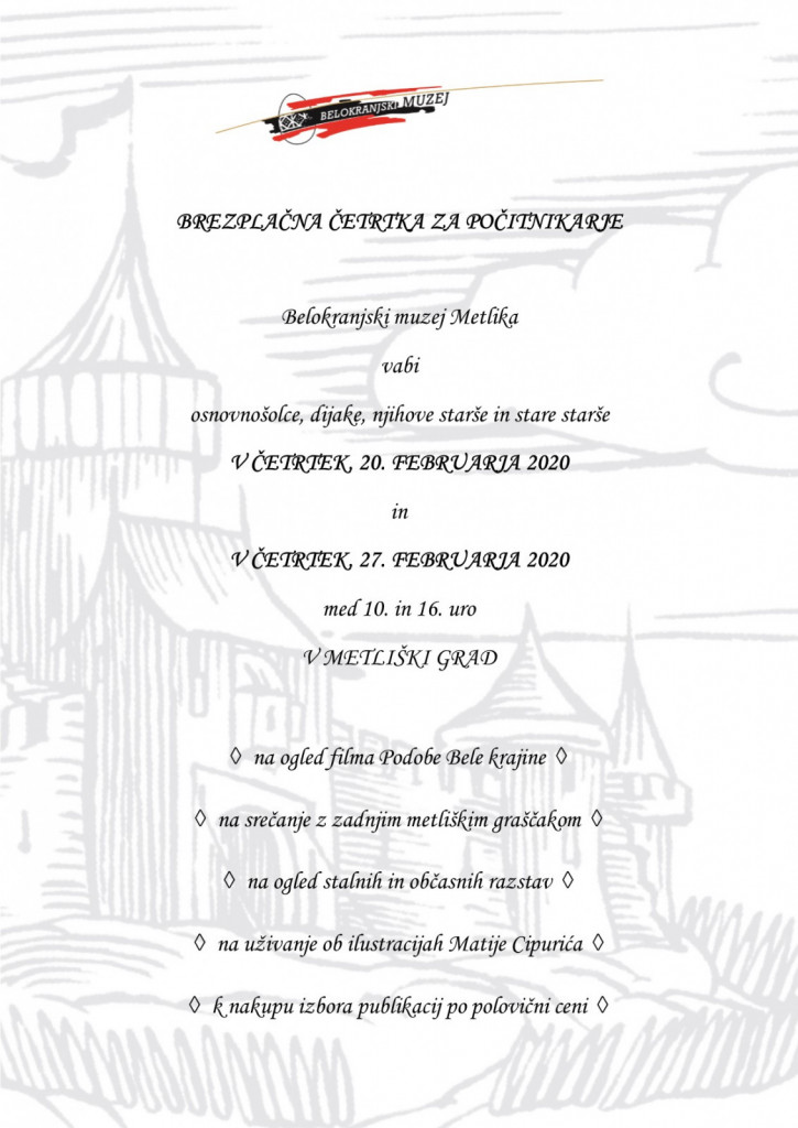 Metliški grad / Bela krajina v odsevu sedmih tisočletijGalerija Kambič Metlika / Ljubiteljev zakladSpominska hiša Otona Župančiča Vinica / ZAČASNO ZAPRTOMuzejska hiša Semič / Semič v dvajsetih slikah in Vinogradniška zbirka