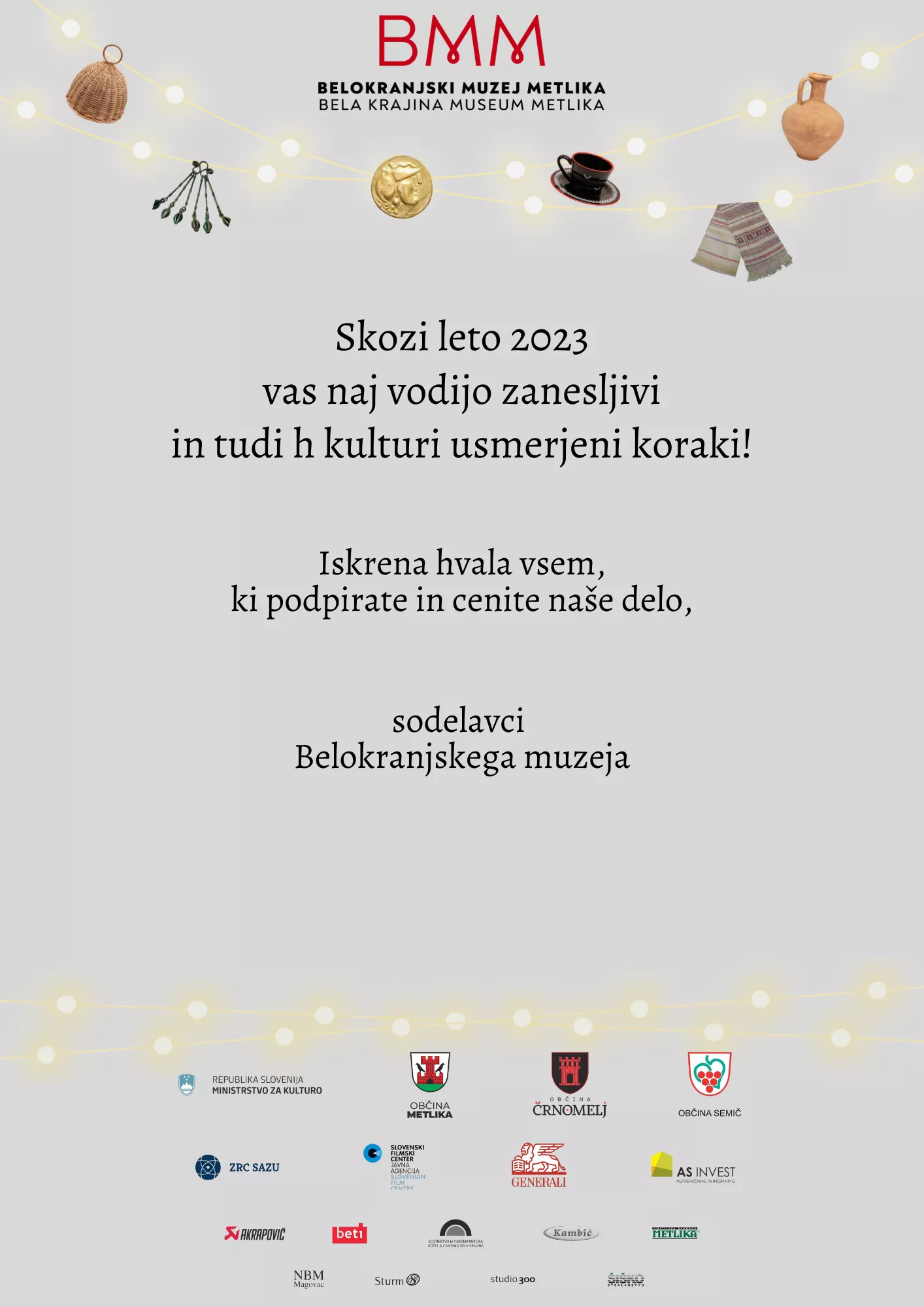 Metliški grad / Bela krajina v odsevu sedmih tisočletijGalerija Kambič Metlika / Ljubiteljev zakladSpominska hiša Otona Župančiča Vinica / ZAČASNO ZAPRTOMuzejska hiša Semič / Semič v dvajsetih slikah in Vinogradniška zbirka