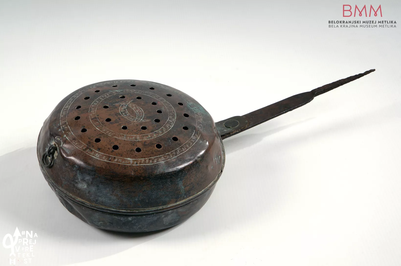 Grelnica, narejena iz bakrene pločevine, pokrov je okrašen z graviranimi okraski in navrtan, ročaj je železen. Okoli leta 1900, Gradac, inv. št.: Z 1750; foto: Branko Babič.